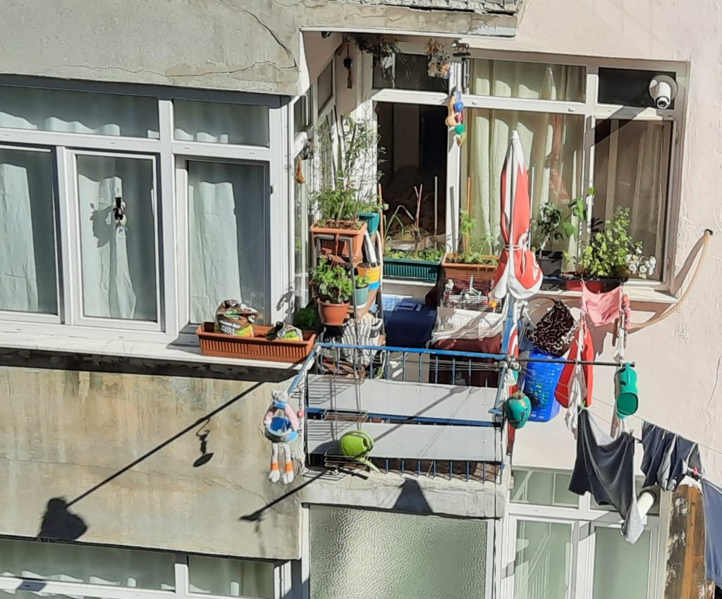 By the late afternoon my head was buzzing both literally and figuratively, so I made a cup of tea and went to the balcony where the woman in the flat opposite had made a new basket to hang from string. Yesterday I had watched as she stitched some rather goth black and lavender roses made of gathered fabric onto the handle of a plastic bucket. Today she had entirely covered a small basket with a disarticulated stuffed cat, so the rope was around the cat’s neck and the legs dangled from the bottom of the basket. Rather terrifying, and she hung it up on a metal rod sticking out of her small balcony. I put in my headphones and started listening to music and sketching the scene on my iPad. It was one of the nicest moments I’ve had in, well, I don’t know, it was one of those calm, happy peaceful times when one almost steps outside oneself.